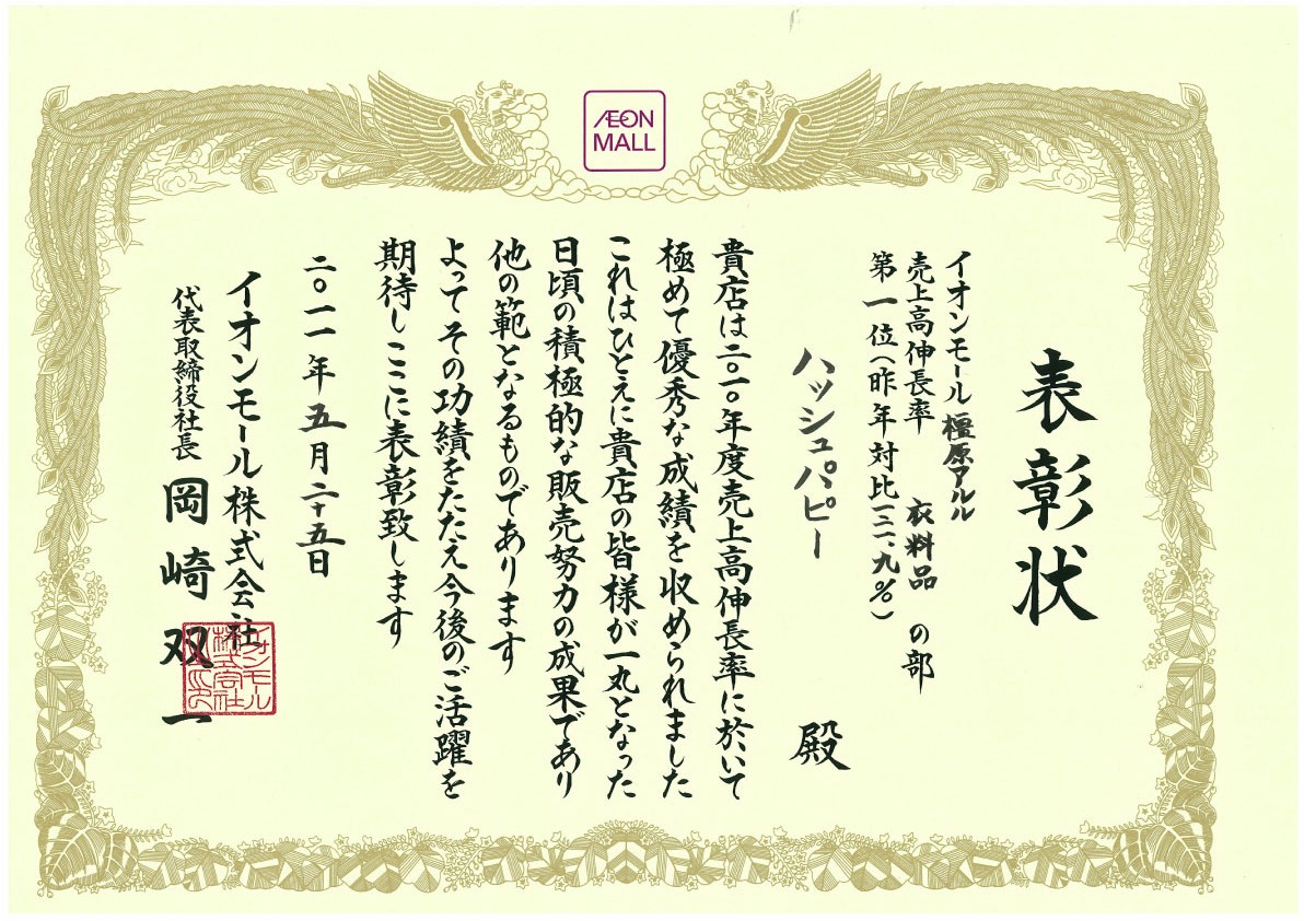 橿原アルル表彰状
