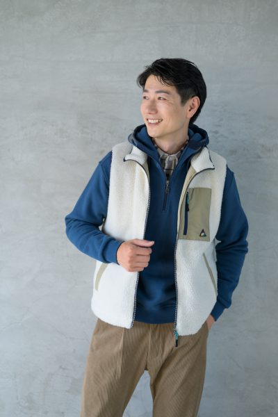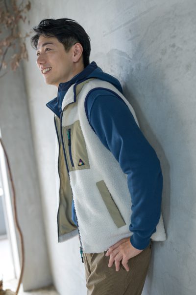 こだわりのデザインパーカーにシンプルなボアベスト。アウトドアテイストのアイテム同士で相性◎
