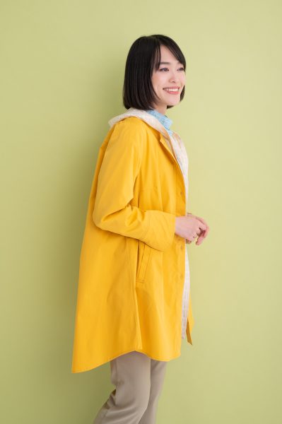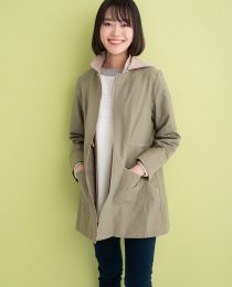 ステッチを効かせたノーカラーコートはハリのある綿混素材を使用!