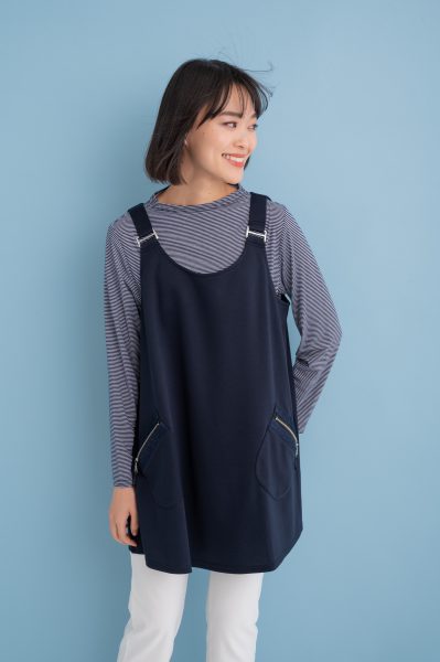 デニム布帛とファスナー使いでアクセントがプラスされたジャンパースカート。