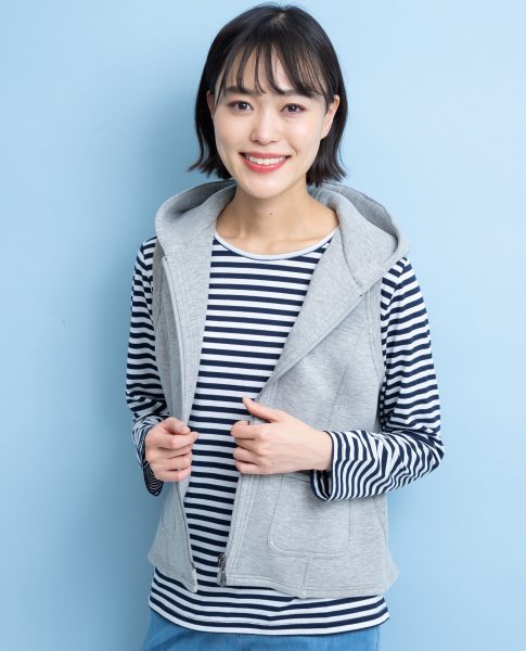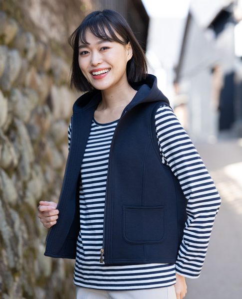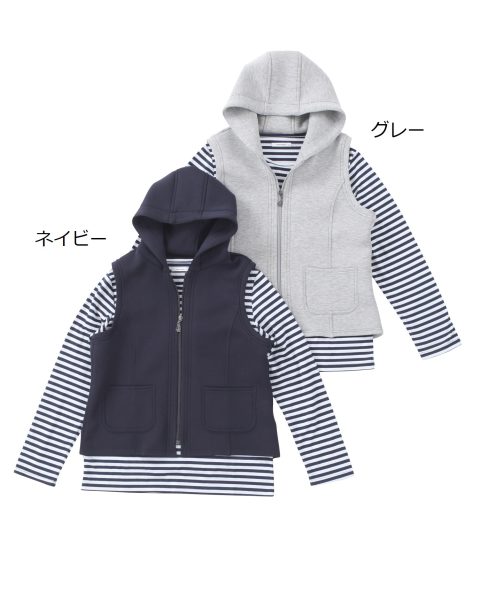 ボーダー柄のインナーに、フード付きベストがセットになったアンサンブル。