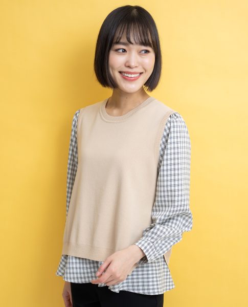 チェック柄のペプラムブラウスとニットベストがセットになった大人気のアンサンブル。