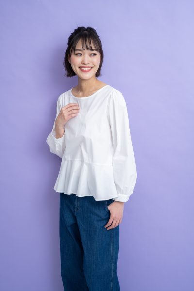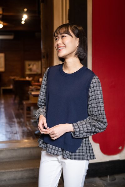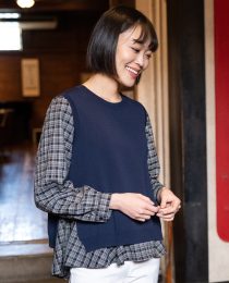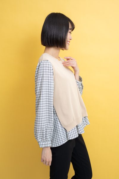 ニットベストはサイドスリットを深めにとり、ペプラムブラウスのシルエットを生かすデザインに!