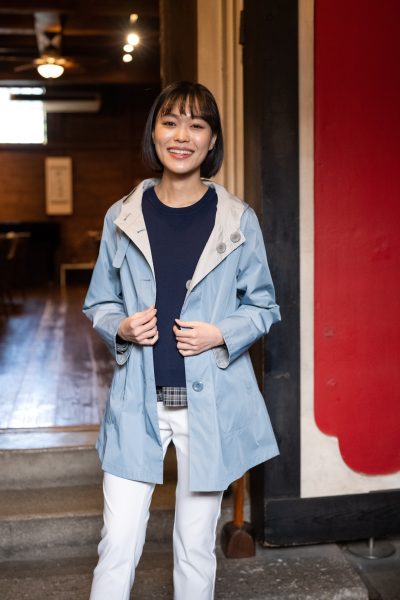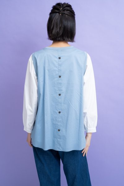 前身の小さなポケットや後身のボタンなど可愛らしいアクセントを散りばめました!
