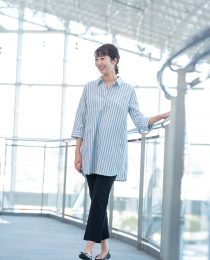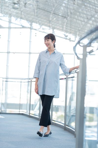 機内はブルゾンを脱いだチュニックスタイル。長めの丈感も安心です(^_-)ストライプ柄でしっかり見えの嬉しいアイテムです。