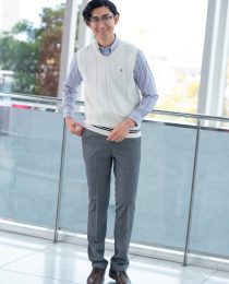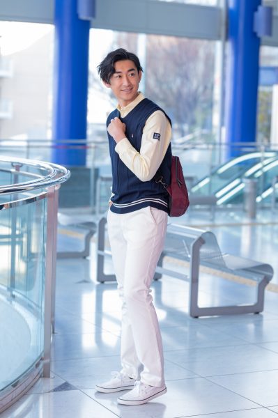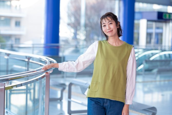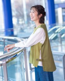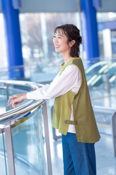 着席が多い機内や空港は、ベストを使ったスタイルがオシャレ見えします♪