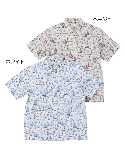 柄シャツと無Tの爽やかなレイヤードスタイル。
