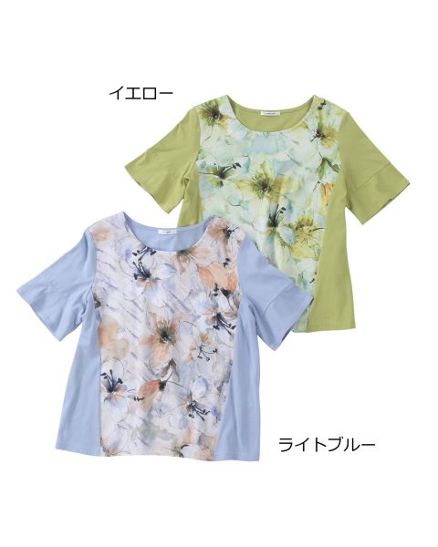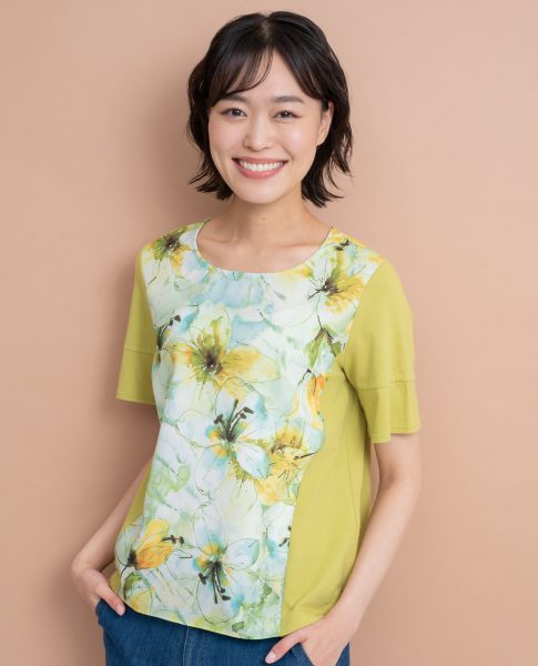 前水彩ぼかし花柄切替Tシャツ