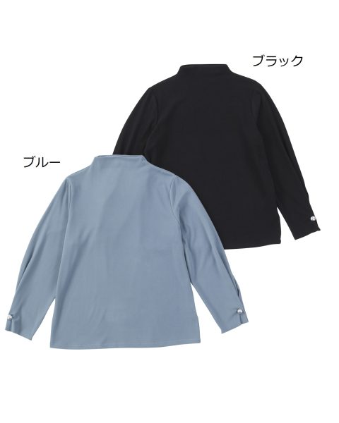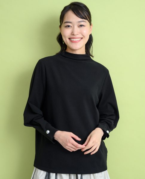 袖口のパール調ボタンがアクセントを効かせるボトルネックプルオーバー。