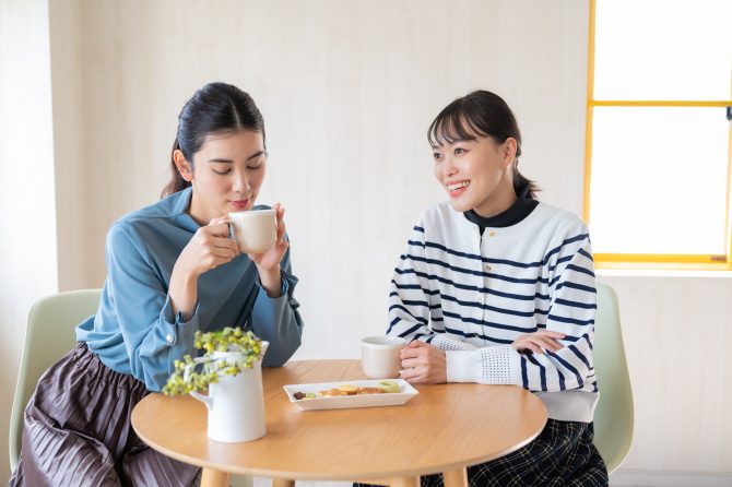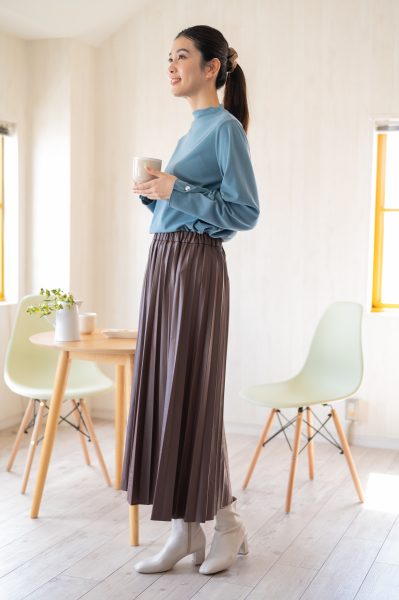 ボトルネックで首元がスッキリ見えて、抜け感もアップ!