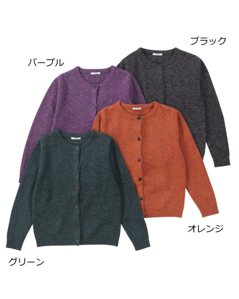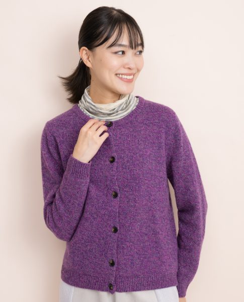 異なった三色の糸を撚り合わせた素材のカーディガン。