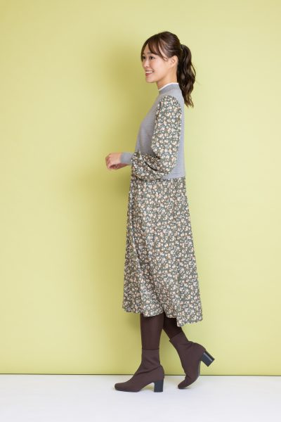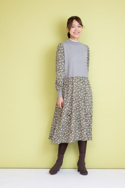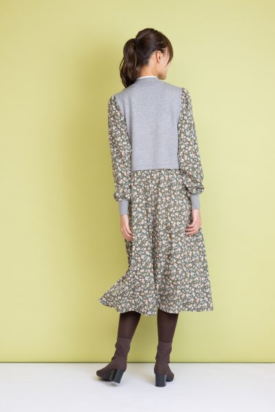 無地と柄がドッキングされたワンピース。ジレとの重ね着風デザインがオシャレなアイテムです❀