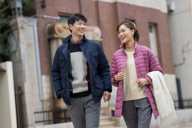 グレーのダウンジャケットとの相性も◎明るく上品な雰囲気に♪