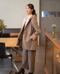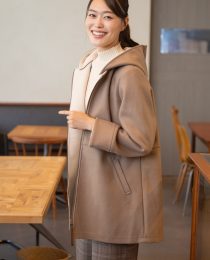 ウール見えするフェルト素材で仕立てた、軽やかなフード付きアウター。