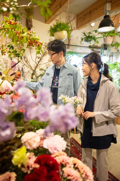 花屋を訪れる春のひとときに、すっとなじむ(*^^*)程よいペアスタイルに!