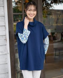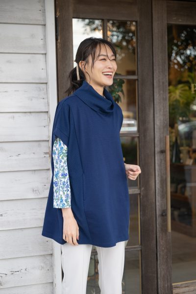 ネイビーのインナーは、リブ生地とカットソー生地を切り替えたチュニック。