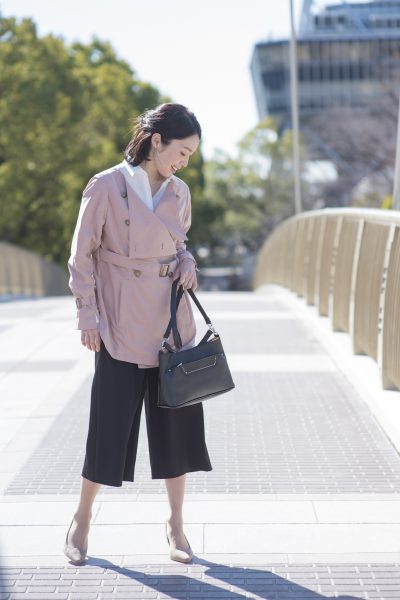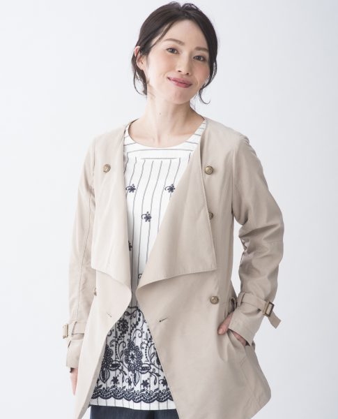 ノーカラートレンチで女性らしさと個性のあるスタイリング