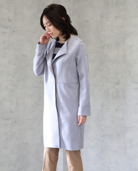 ソフトなスエード調生地を使用した、羽織るだけでレディに仕上がるロングコート。