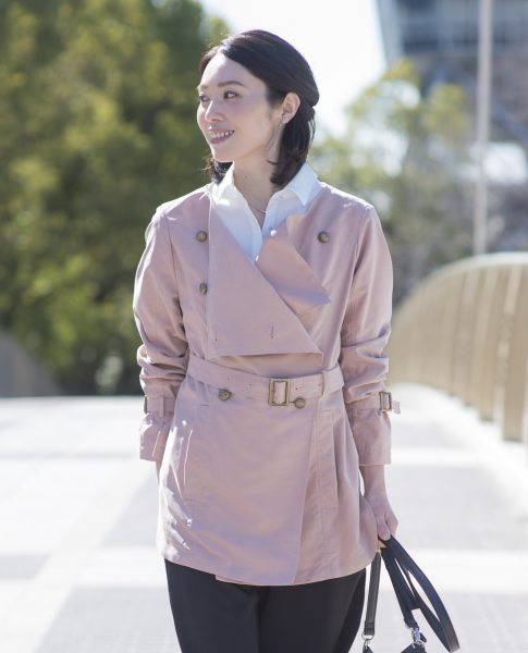 軽量なポリエステル素材を使用したショートトレンチコート。