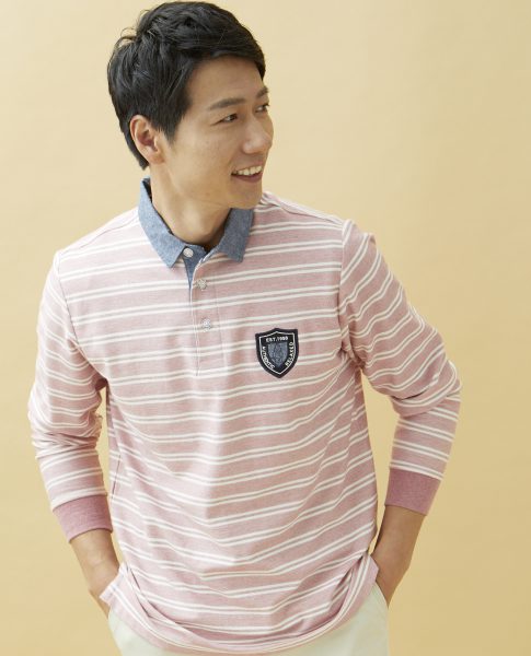 大人ラガーシャツは衿部分にデニム調生地で抜け感を