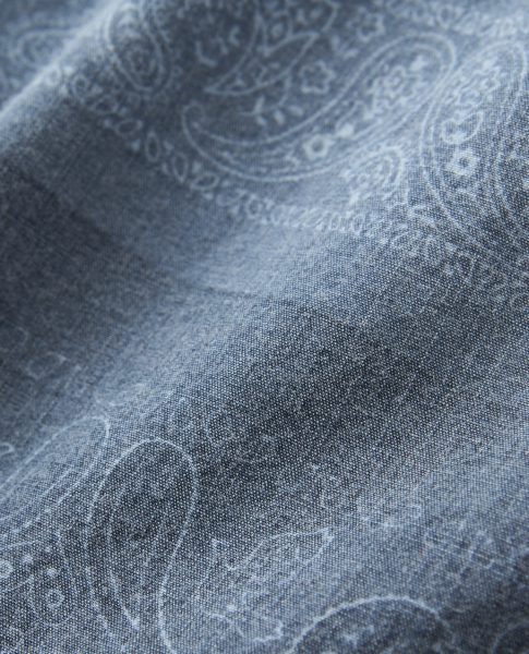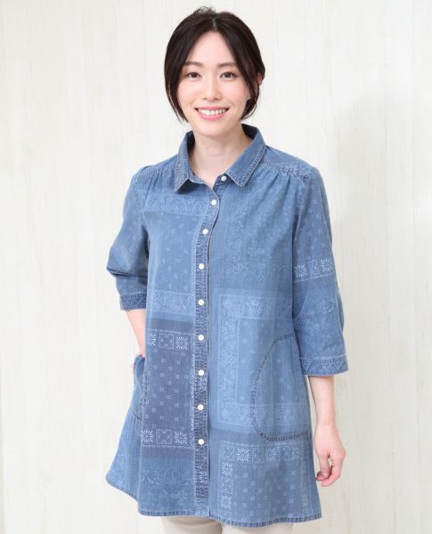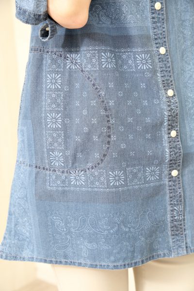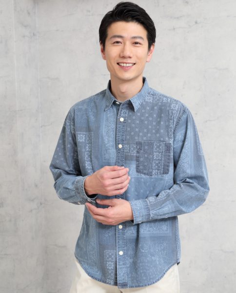 コットン100%生地を使用したデニムシャツ。バンダナ柄のパッチワーク風プリントでカジュアルスタイルに遊び心をプラスしました。