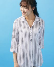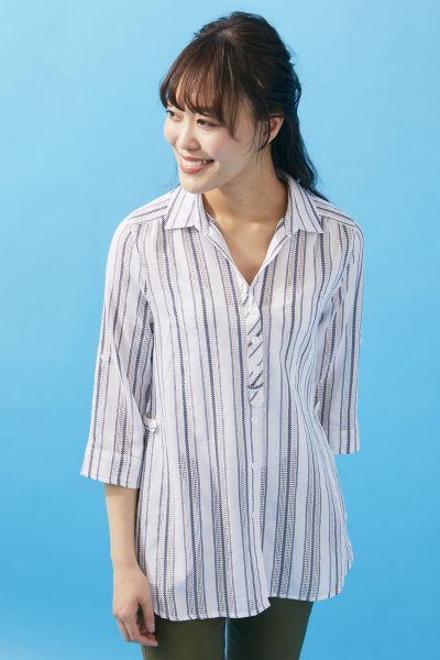 コットン100%のサラリとした素材を使用したシャツチュニック。スキッパー衿ですっきりとした印象。レースのラインをミックスしたストライプで清涼感のあるスタイリングに仕上げました。