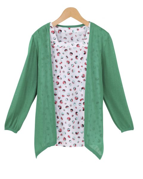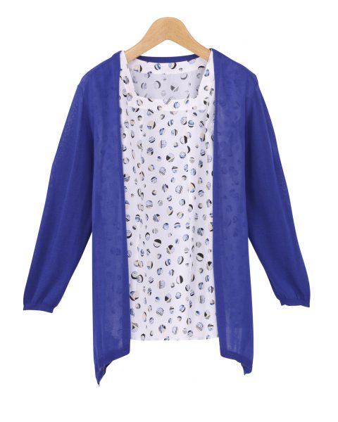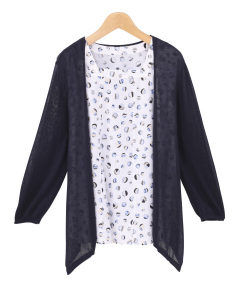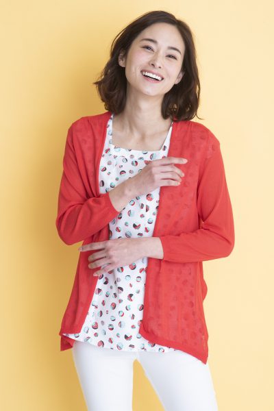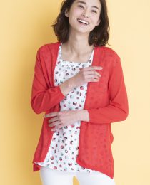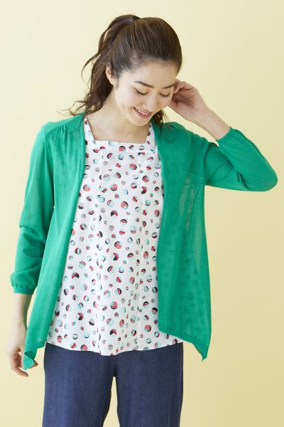 鮮やかなカラーリングのカーディガンと、夏を先取りする総柄模様のプルオーバのアンサンブル。
