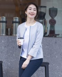 ドライな風合の綿ピケ素材を使用したノーカラージャケットと、ラインストーンが華やかなTシャツのアンサンブルアイテム。
