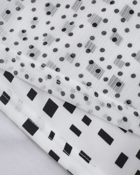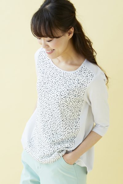 ランダムなスクエア柄と、ドット柄をレイヤードさせたプルオーバーは、
