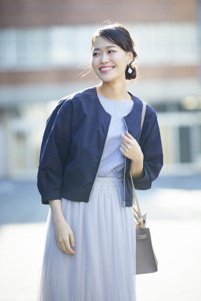 首元が綺麗に見える広めのボートネックもスタイルアップのポイントです。