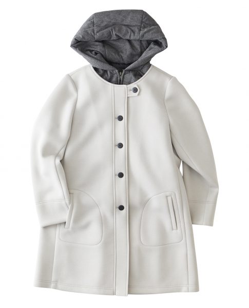 コートから飛び出すフードが旬ポイント!今っぽいスタイリングになります。